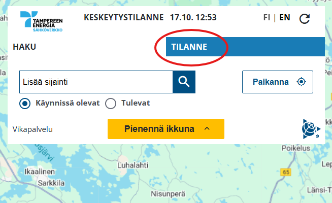 Vikakartalta näet myös viikon ajalta, miten palvelutasomme on vaihdellut suunnittelemattomien sähkökatkojen ja suunniteltujen keskeytysten osalta. Löydät historiatiedot, kun klikkaat TILANNE-sanaa kartalla (kuva alla).