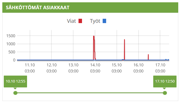 Historiatieto sähkökatkoista näkyy aikajanalla, jonka pituutta voit itse säädellä. Voit katsoa koko viikon katkot kerralla, kuten kuvassa. Voit myös katsoa vaikka vain yhden vuorokauden ajalta tiedot siirtämällä vihreitä palloja aikajanan päissä.