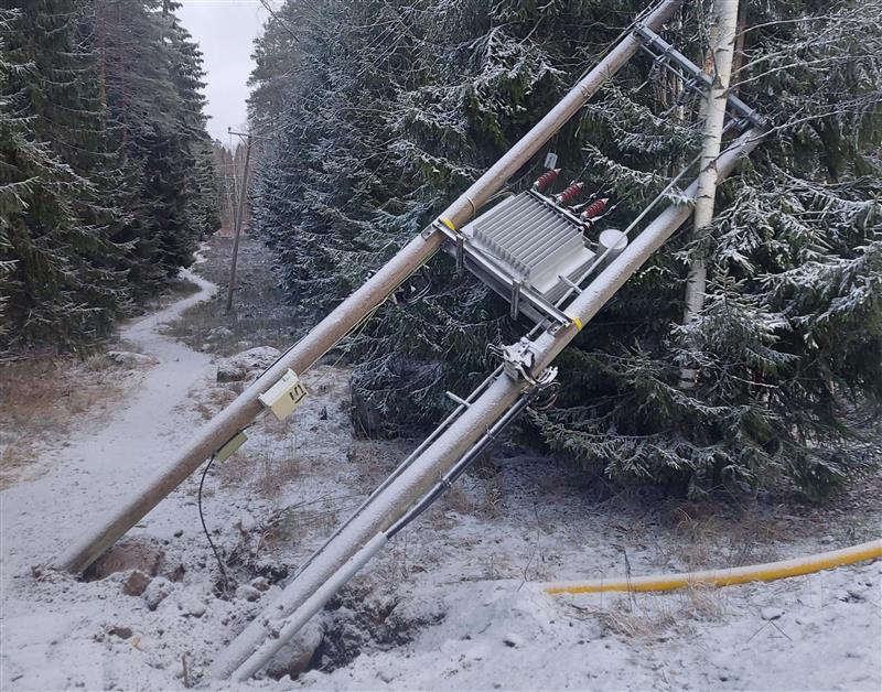 Kuvassa tuhoutunut pylväsmuuntamo, jolle olemme nyt rakentaneet korvaavan verkon maakaapelina.